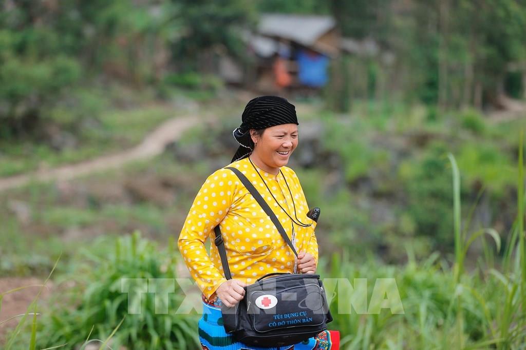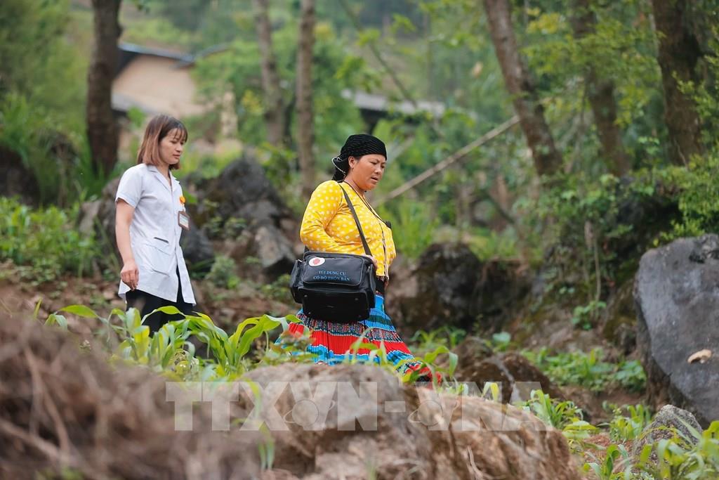 Cô đỡ thôn bản phối hợp với nhân viên trạm y tế đến hộ gia đình trong xã. Ảnh: Minh Quyết - TTXVN