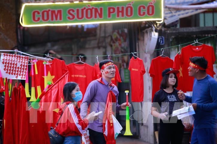 Rất nhiều cờ đỏ sao vàng, áo, băng rôn in chữ “ Việt Nam chiến thắng” được bán trên phố Trịnh Hoài Đức phục vụ người hâm mộ. Ảnh: Trọng Đạt - TTXVN