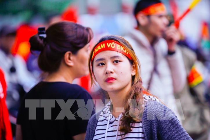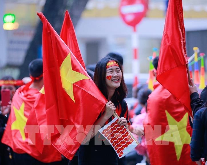 Người hâm mộ với cờ và băng rôn cổ vũ cho đội tuyển Việt Nam. Ảnh: Trọng Đạt - TTXVN