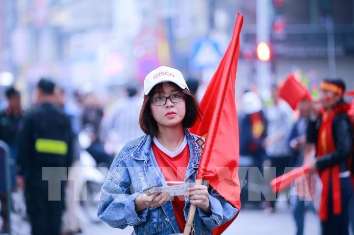 Một cổ động viên nữ mang theo cờ chuẩn bị vào sân vận động Hàng Đẫy cổ vũ cho đội tuyển Việt Nam. Ảnh: Trọng Đạt - TTXVN
