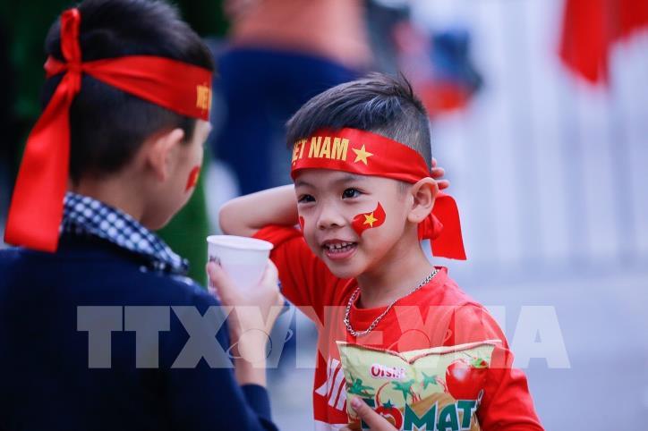 Một cổ động viên nhí theo bố mẹ đi cổ vũ cho đội tuyển Việt Nam. Ảnh: Trọng Đạt - TTXVN
