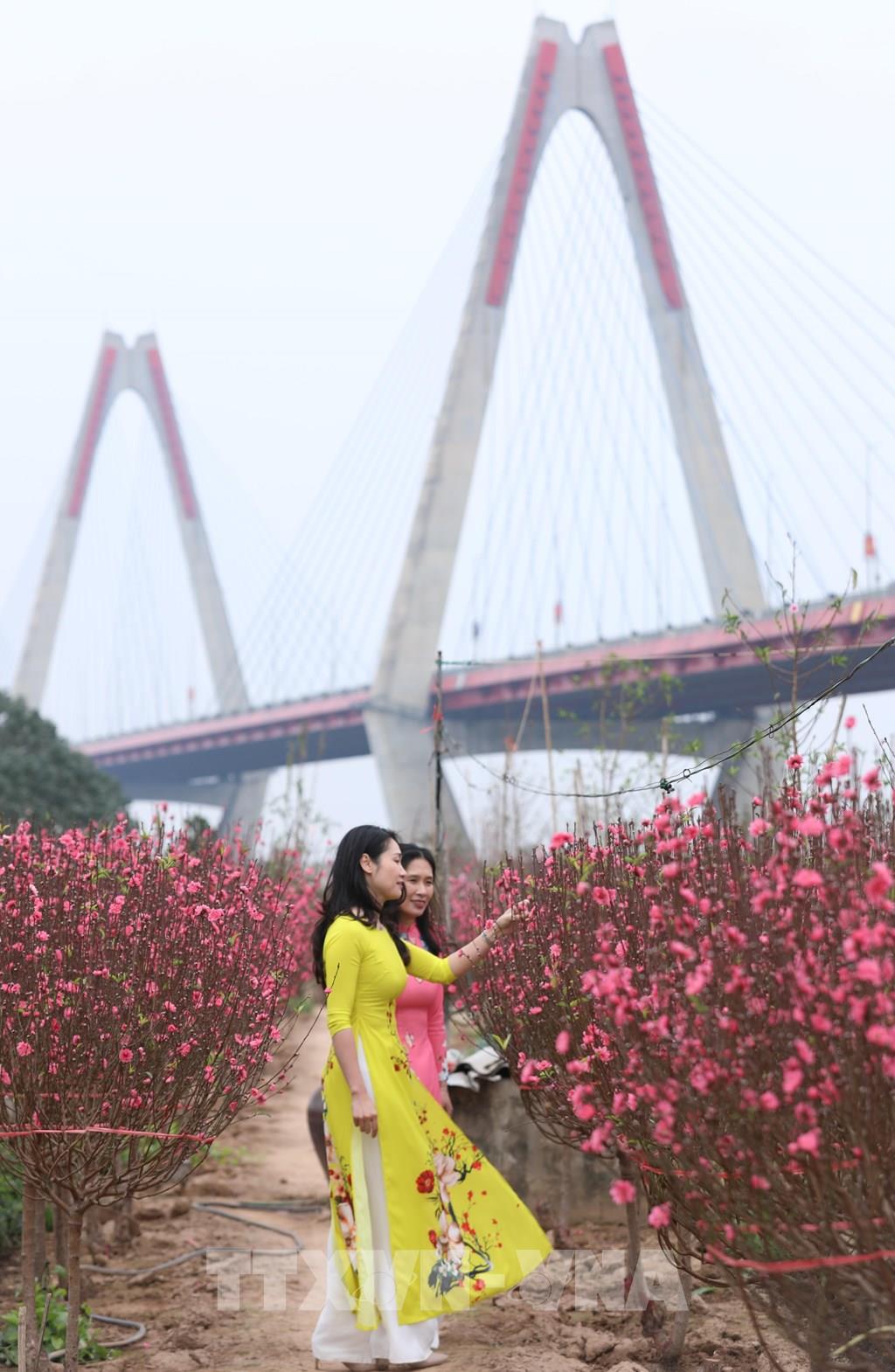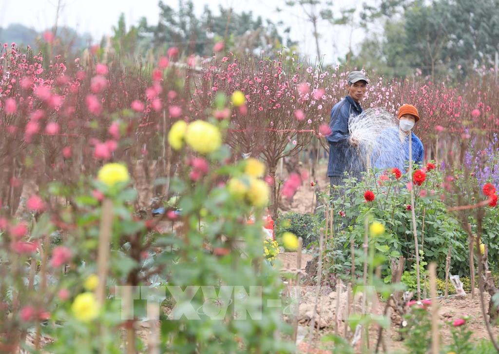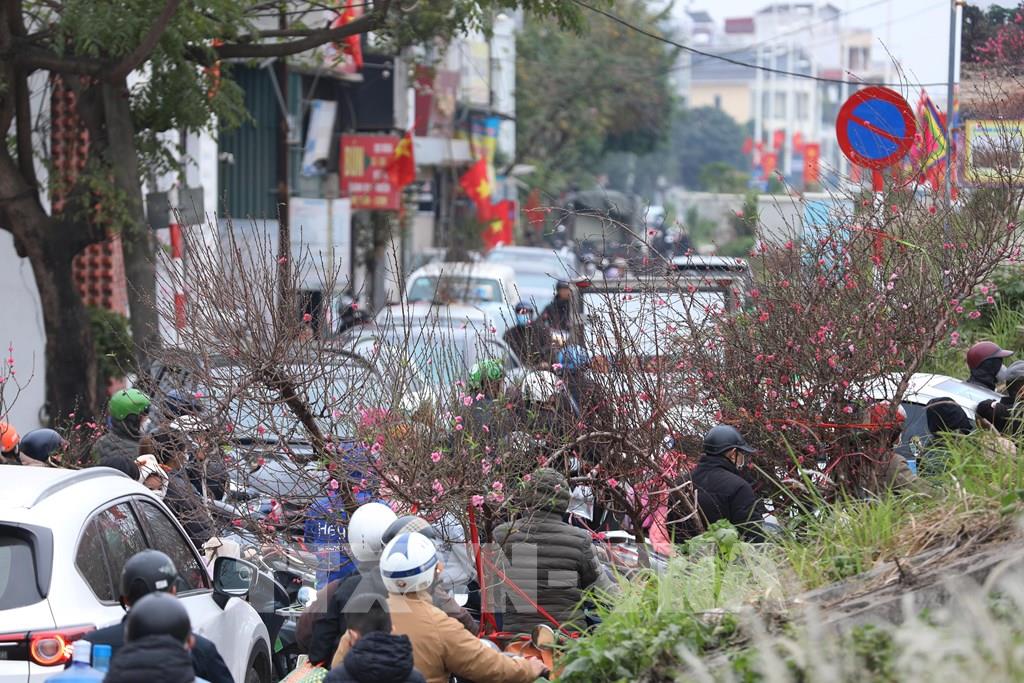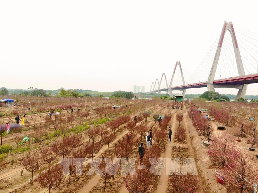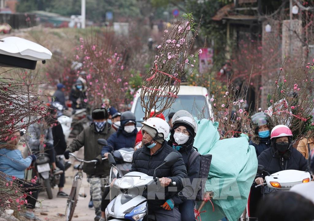 Đào hồng, đào phai khoe sắc, những con người hối hả ngược xuôi trong không khí đón Xuân tại các con đường gần làng Nhật Tân. Ảnh: Hoàng Hiếu - TTXVN