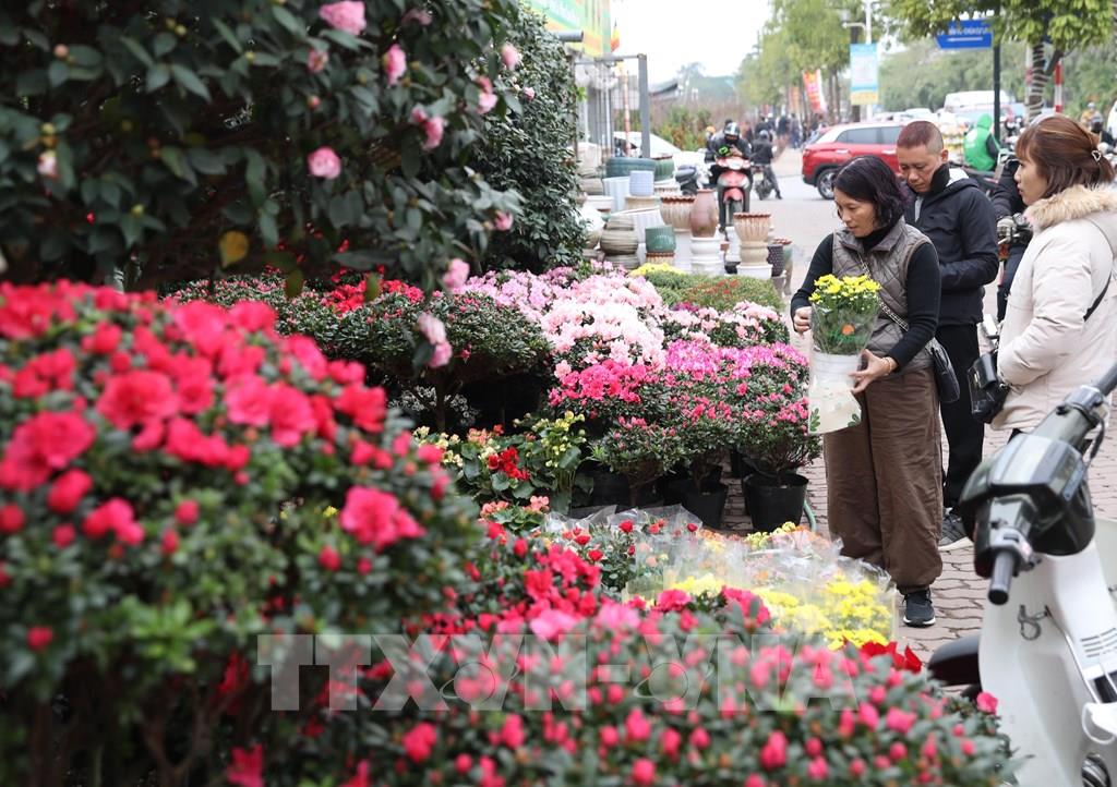 Sắc xuân ngập tràn trên phố hoa, cây cảnh phố Cổ Linh (Long Biên). Ảnh: Hoàng Hiếu - TTXVN