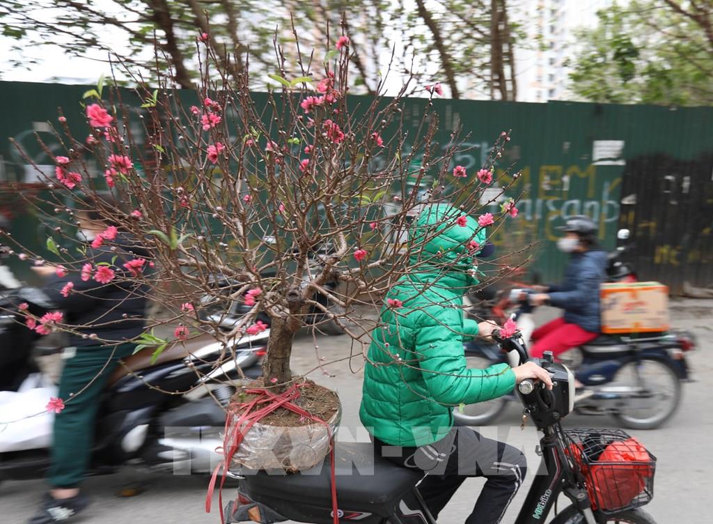 Đào hồng, đào phai khoe sắc, những con người hối hả ngược xuôi trong không khí đón Xuân. Ảnh: Hoàng Hiếu - TTXVN