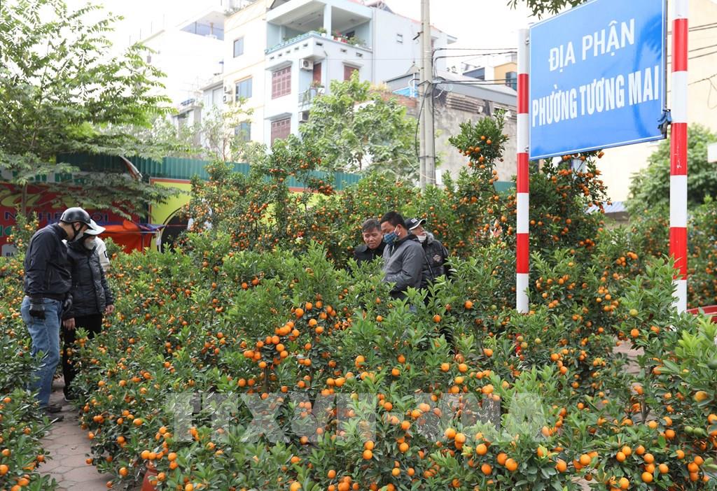 Người dân chọn quất tại Chợ hoa Xuân quận Hoàng Mai. Ảnh: Hoàng Hiếu - TTXVN