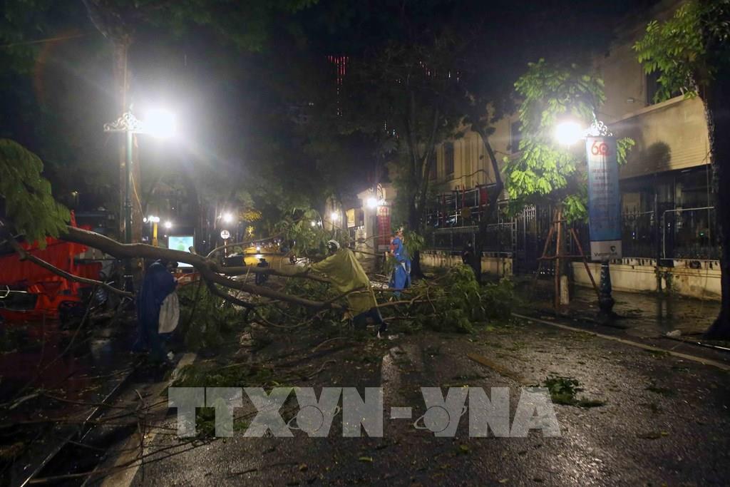 Công nhân công ty cây xanh xử lý cây đổ trên phố Cổ Tân (Hà Nội) sau cơn mưa tối 22/6 . Ảnh: Tuấn Đức - TTXVN