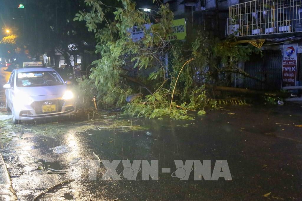 Cơn mưa lớn kèm gió to khiến cây đổ ngang đường trên phố Đội Cấn. Ảnh: Thành Đạt - TTXVN