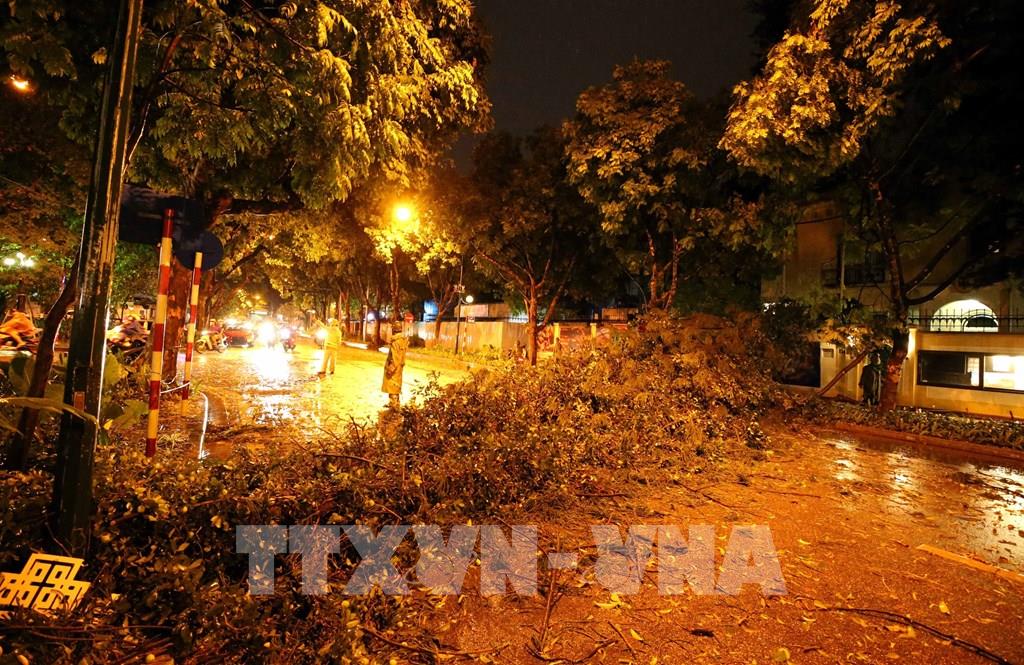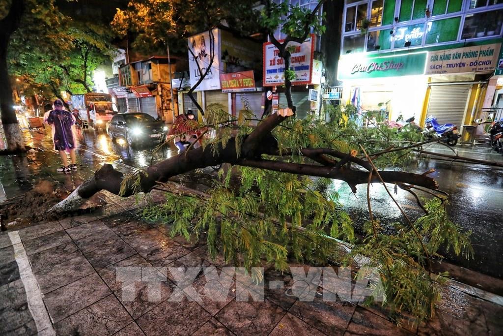 Cơn mưa lớn đã làm cây đổ ngang đường tại phố Trần Phú, Quận Ba Đình, Hà Nội. Ảnh: Phạm Kiên - TTXVN