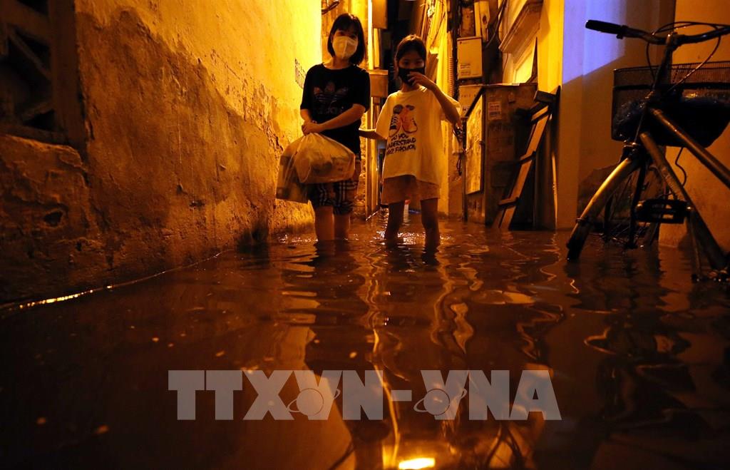 Cơn mưa lớn làm ảnh hưởng đến sinh hoạt của một số hộ dân sống tại ngõ 90, phố Đội Cấn (Hà Nội). Ảnh: Phạm Kiên - TTXVN