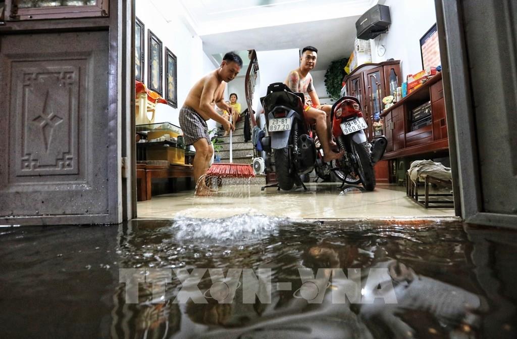 1 hộ gia đình ngõ 90, phố Đội Cấn (Hà Nội) tát nước từ trong nhà ra sau cơn mưa lớn tối 22/6. Ảnh: Thành Đạt - TTXVN