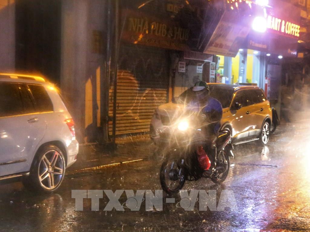 Mưa to kèm gió mạnh khiến các phương tiện di chuyển chậm. Ảnh: Tuấn Đức - TTXVN