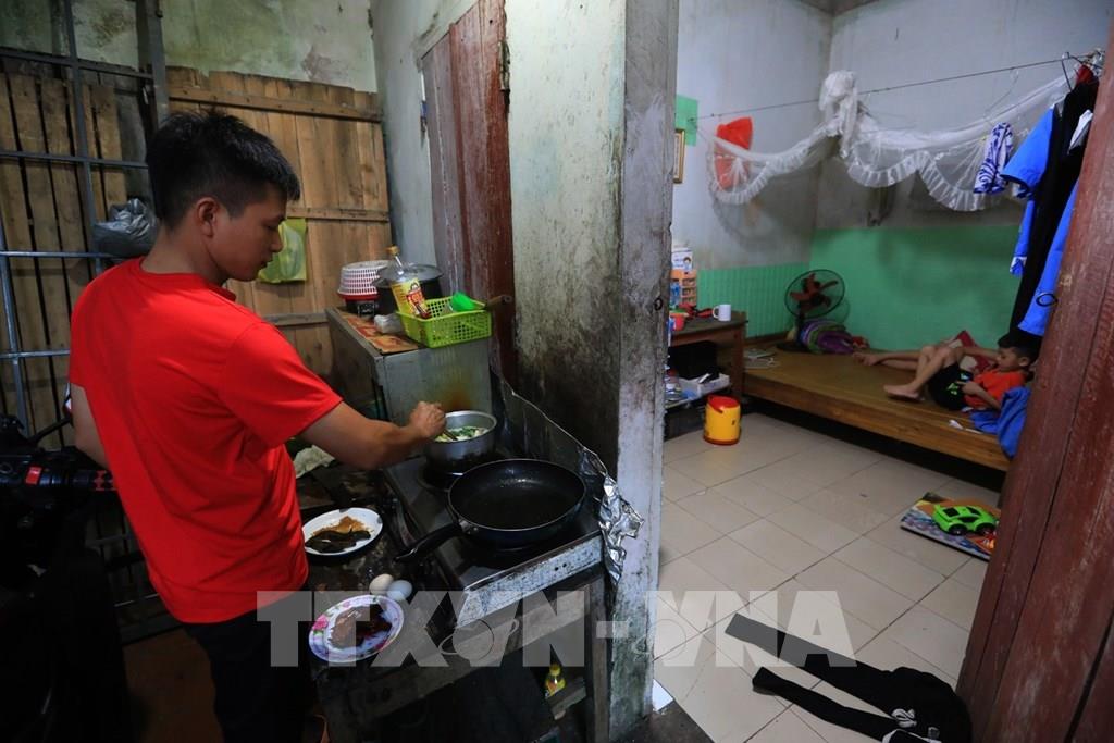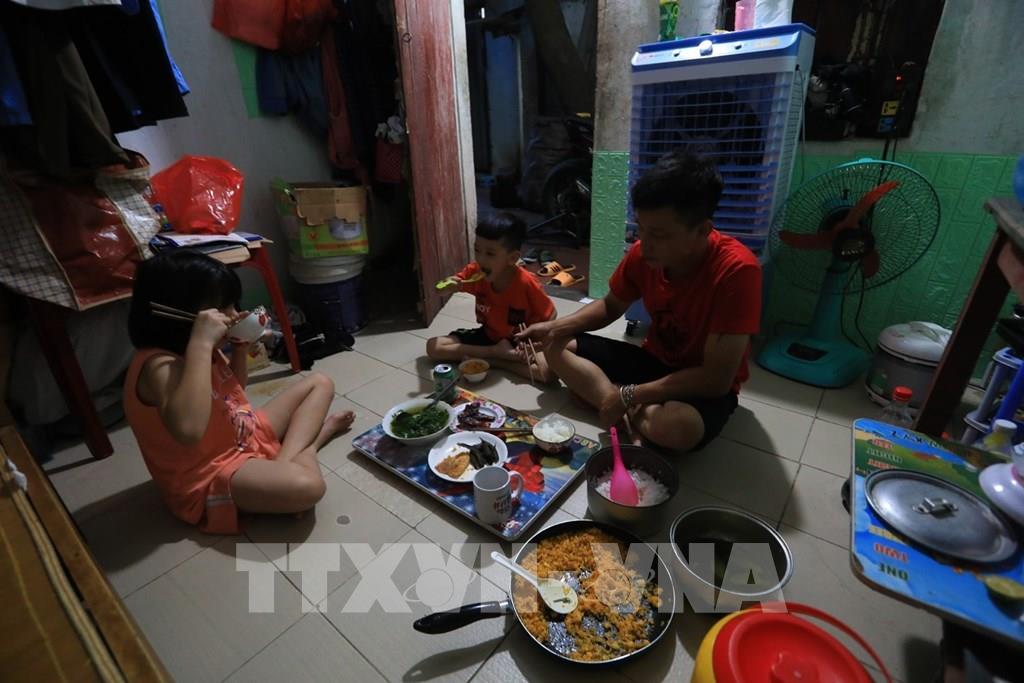 Bữa cơm tối tại xóm trọ sau giờ tan ca của gia đình công nhân Nguyễn Văn Toàn. Ảnh: Phan Tuấn Anh - TTXVN