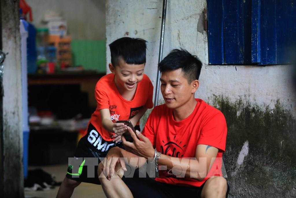 Không thể về quê trong những ngày giãn cách, anh Nguyễn Văn Toàn (Công ty Cổ phần Kỹ thuật bao bì Cửu Long, khu công nghiệp Quang Minh) cùng con trai thường xuyên gọi điện hỏi thăm ông bà và gia đình. Ảnh: Phan Tuấn Anh - TTXVN