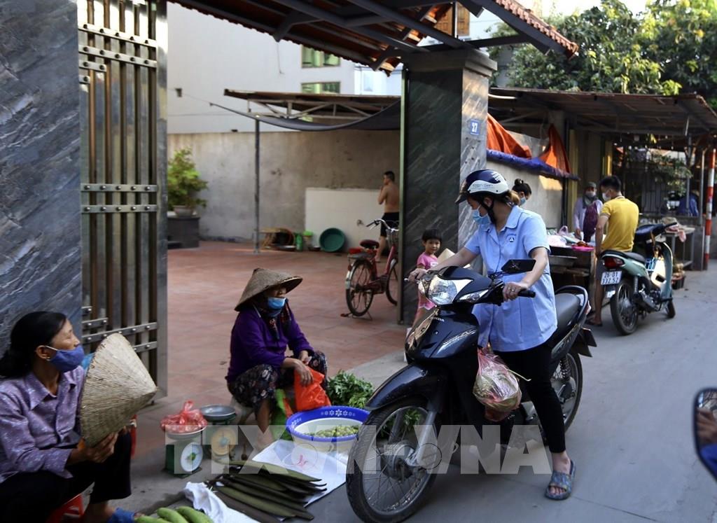 Một nữ công nhân khu công nghiệp Quang Minh tranh thủ đi chợ khi được nghỉ giữa giờ làm. Ảnh: Hoàng Hiếu - TTXVN