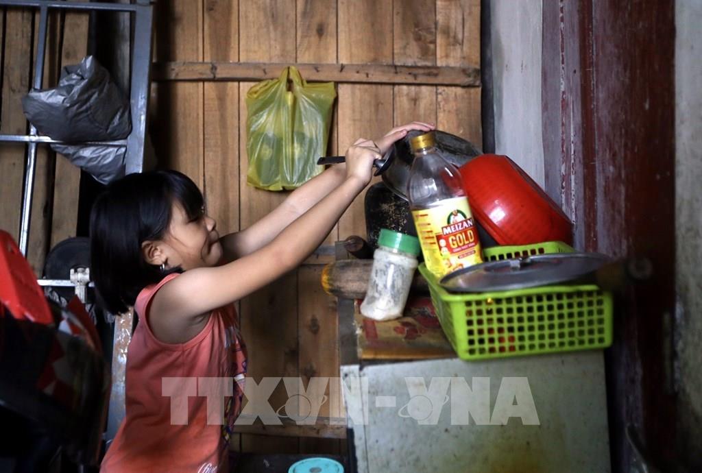 Nguyễn Đồng Trà Mỹ (8 tuổi) đã phải tự nấu cơm, trông em trong khi bố mẹ đi làm. Ảnh: Hoàng Hiếu - TTXVN