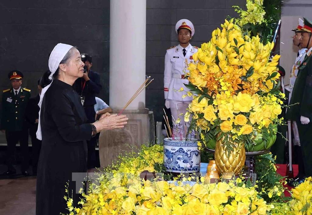 Phu nhân Ngô Thị Mận thắp hương viếng Tổng Bí thư Nguyễn Phú Trọng. Ảnh: TTXVN