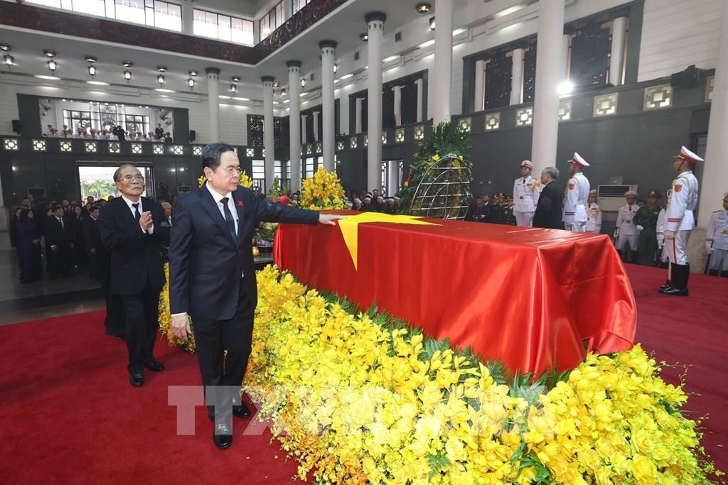 Đoàn Quốc hội do đồng chí Trần Thanh Mẫn, Ủy viên Bộ Chính trị, Chủ tịch Quốc hội làm Trưởng đoàn, kính viếng Tổng Bí thư Nguyễn Phú Trọng. Ảnh: TTXVN