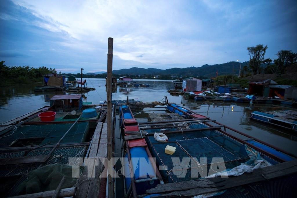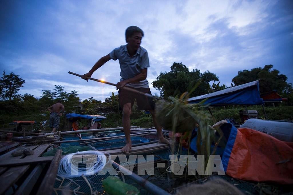 Khi thủy điện Hòa Binh xả nước thì các hộ gia đình có lồng bè nuôi cá lồng ở làng vạn chài sẽ ngay lập tức di rời các lồng bè vào một con ngòi ngay phía hạ lưu để tránh nước lũ. Ảnh: Trọng Đạt-TTXVN