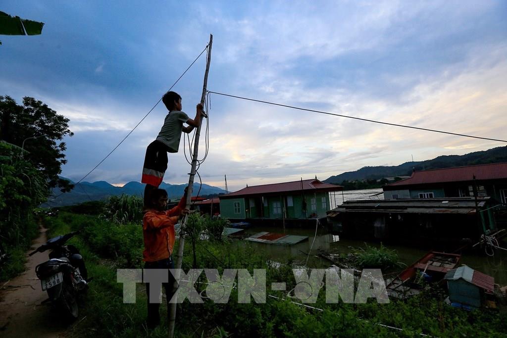 Hai bố con đang kéo lại đường dây điện để thắp sáng khi thủy điện Hòa Bình mở cửa xả lũ đầu tiên ngày 12/6/2022 làm nước sông Đà dâng cao gây chia cắt các hộ và xảy ra các sự cố về dây điện tại làng vạn chài. Ảnh: Trọng Đạt-TTXVN