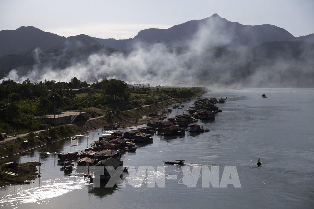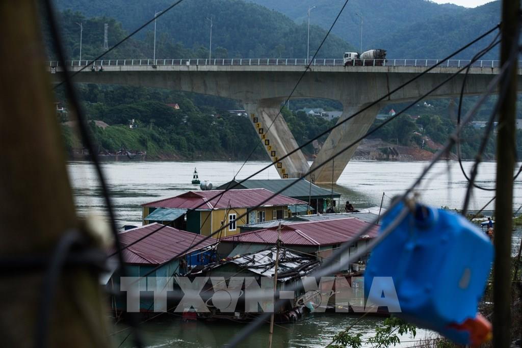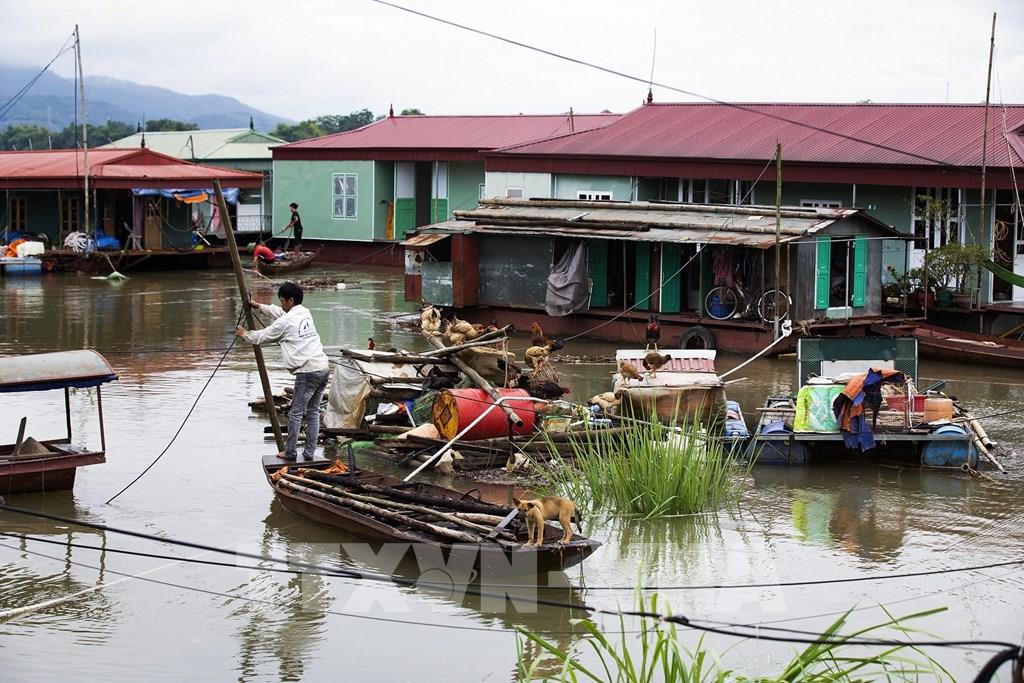 Làng vạn chài khi mùa nước lũ về trên sông Đà và thủy điện Hòa Bình xả lũ. Ảnh: Trọng Đạt-TTXVN