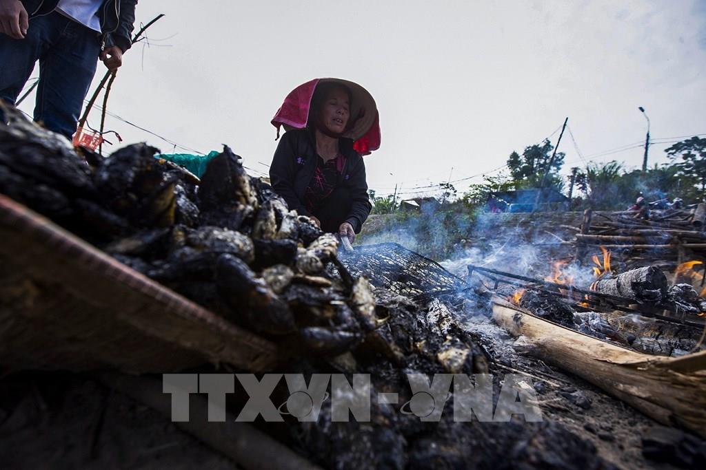Bà Thú nướng những con cá nhỏ để làm mồi câu, chồng và con trai bà sẽ sử dụng để đi đánh lưới trên sông Đà những lúc chiều tối. Ảnh: Trọng Đạt-TTXVN