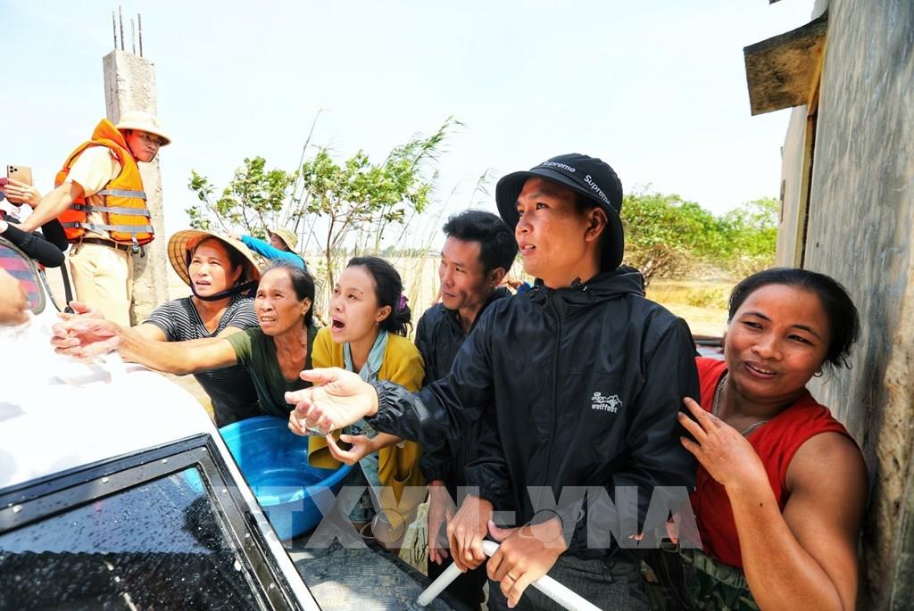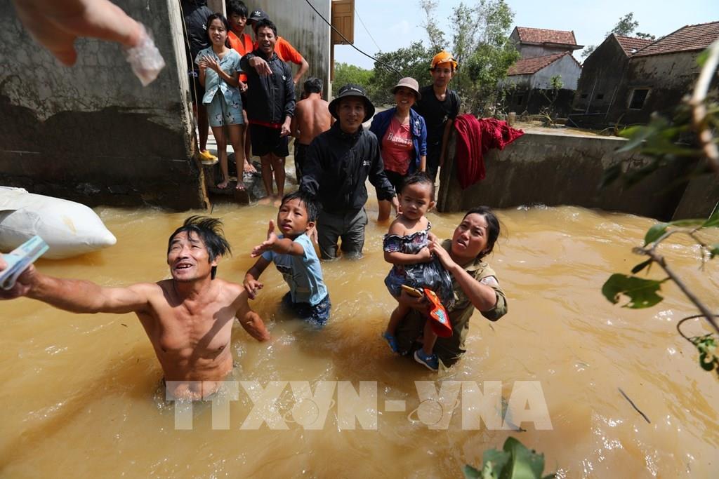 Niềm vui của người dân thôn Phú Thọ, xã An Thủy, huyện Lệ Thủy khi có đoàn đến cứu trợ. Ảnh: Thành Đạt - TTXVN