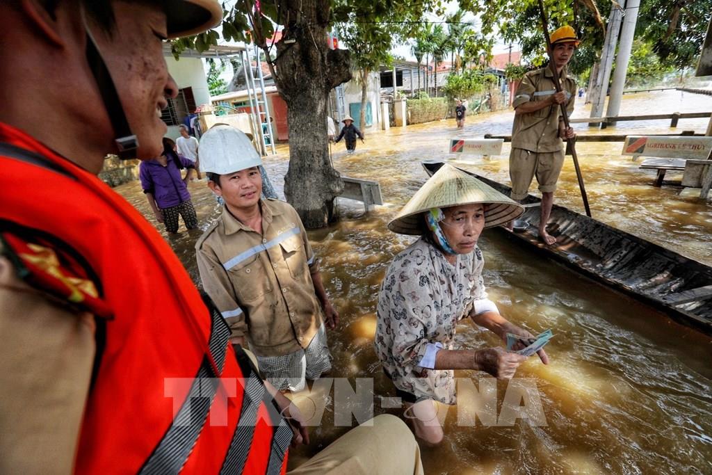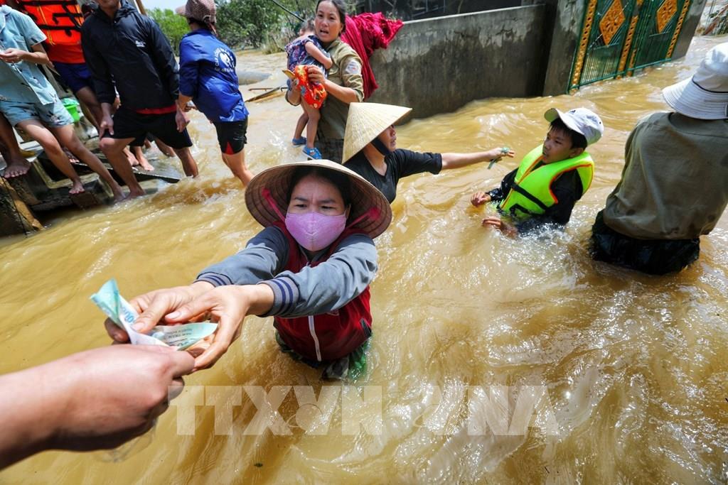Người dân thôn Phú Thọ nhận tiền cứu trợ trong dòng nước lũ vẫn ngập sâu. Ảnh: Thành Đạt - TTXVN