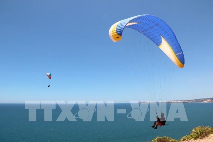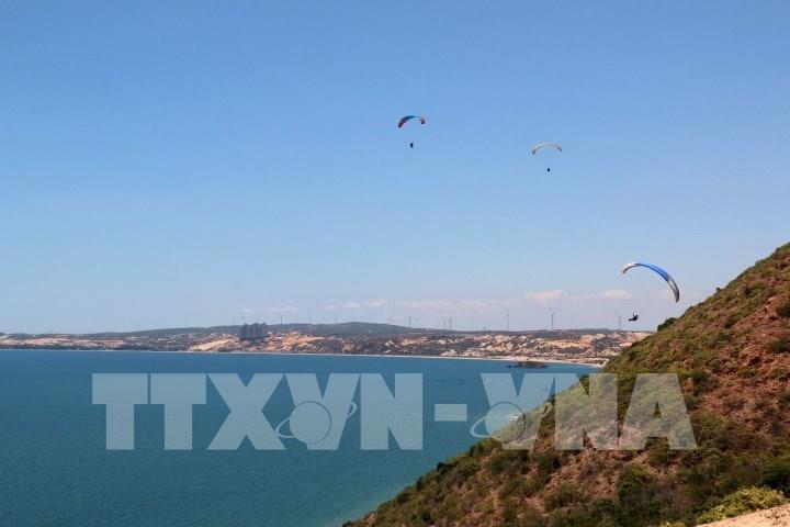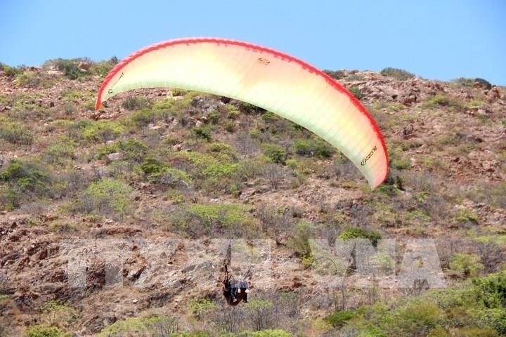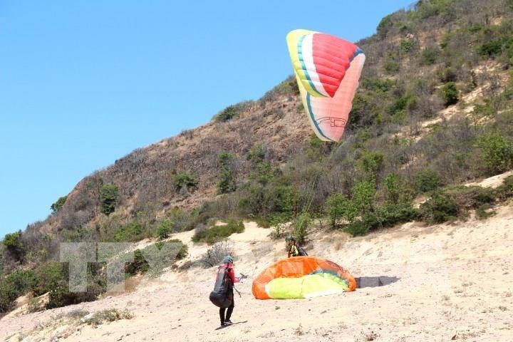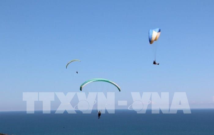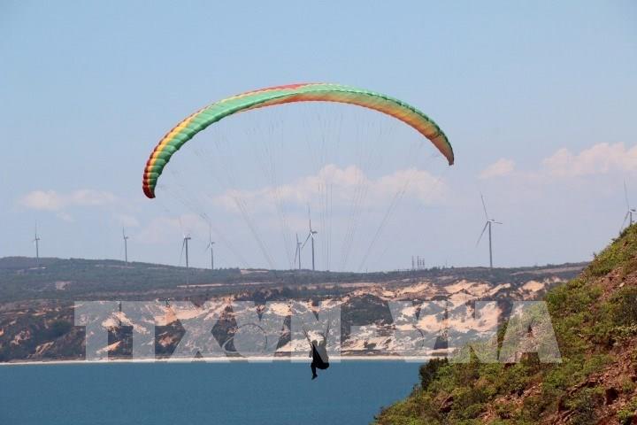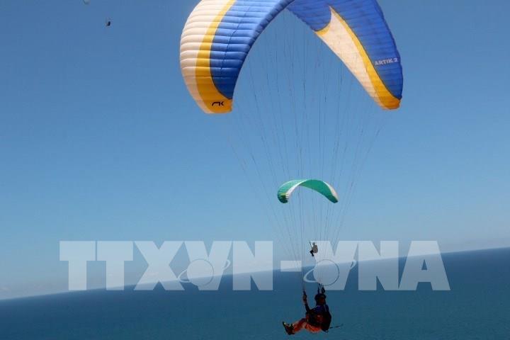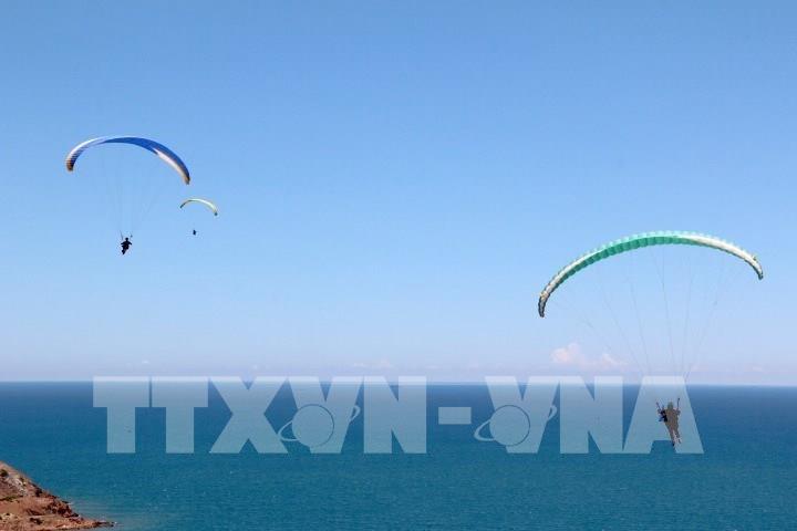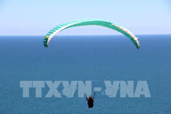 Với trò dù lượn mạo hiểm, người chơi sẽ được ngắm nhìn cảnh núi và biển tuyệt vời bằng góc nhìn trên cao. Ảnh: Nguyễn Thanh - TTXVN