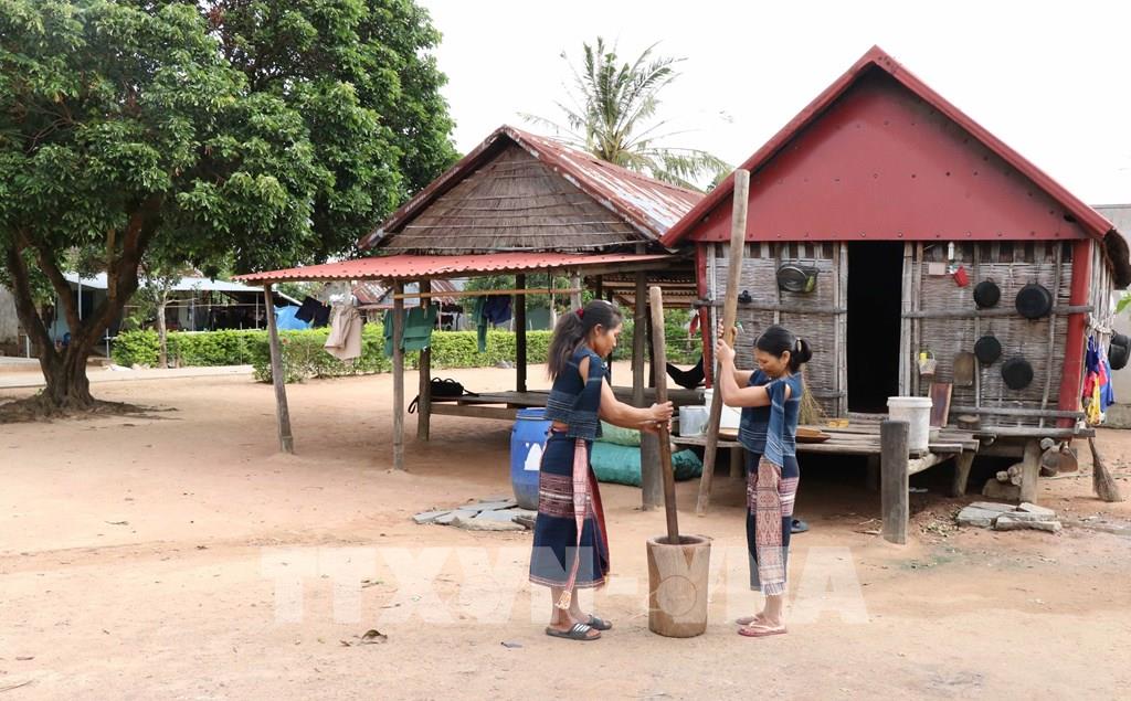 Vào ngày làng tổ chức Lễ mừng lúa mới, nhà nhà đều phải giã cốm để đem cúng Yang Sri (Thần Lúa). Ảnh: Hồng Điệp - TTXVN