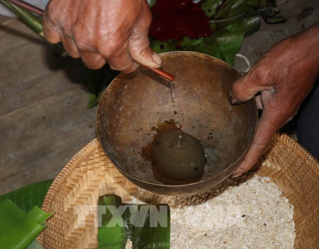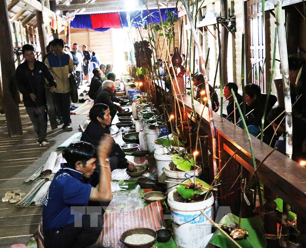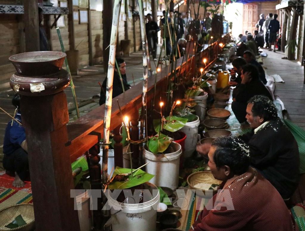 Vào dịp này, những người đàn ông khi làm lễ tạ ơn tại nhà Rông đều khấn cầu Yang Sri ban sức khỏe cho mọi thành viên trong gia đình và mong năm sau dân làng sẽ có vụ mùa bội thu. Theo thường lệ, mọi nhà sẽ chọn khoảnh lúa tốt nhất, đẹp nhất để dành riêng cho việc cúng Yang Sri. Ảnh: Hồng Điệp - TTXVN