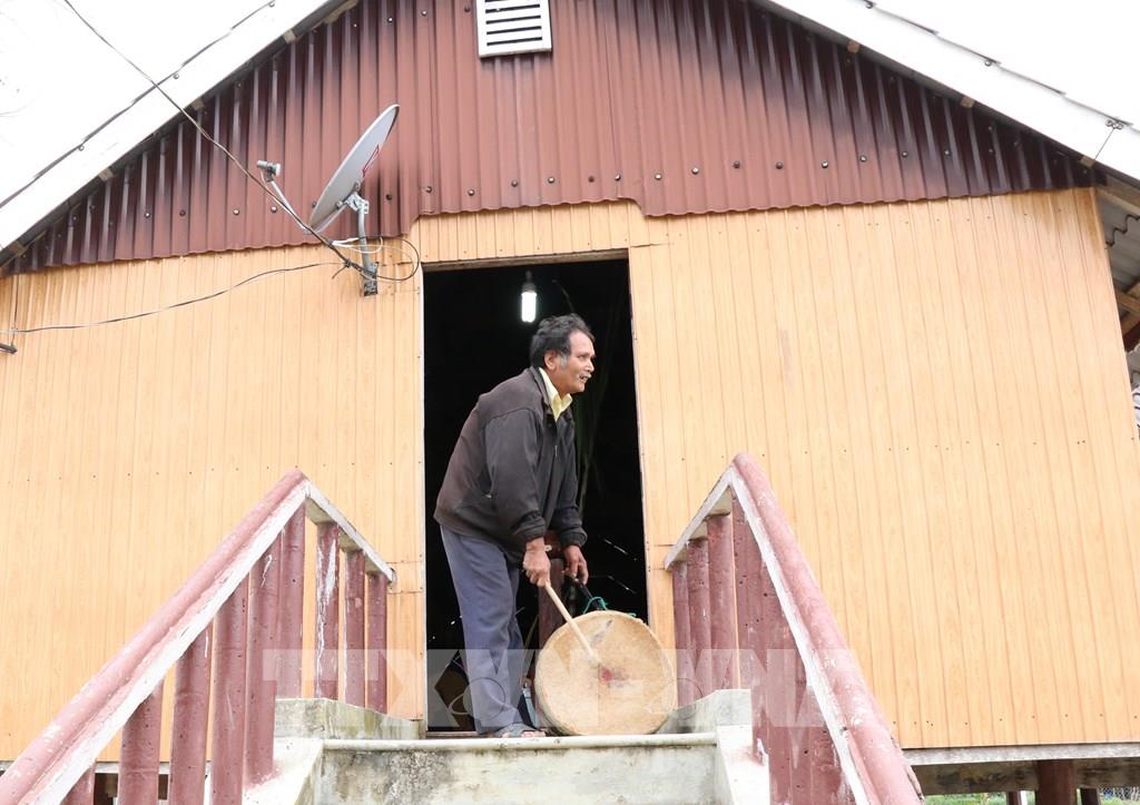 Già làng đánh trống giục mọi người trong làng tập trung về nhà Rông để tổ chức cúng Yang Sri (Thần Lúa) trong Lễ mừng lúa mới. Ảnh: Hồng Điệp - TTXVN