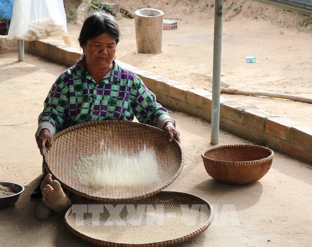 Phụ nữ trong làng sàng sảy từng mẻ cốm vừa giã để dâng cúng Yang Sri (Thần Lúa) trong Lễ mừng lúa mới. Ảnh: Hồng Điệp - TTXVN