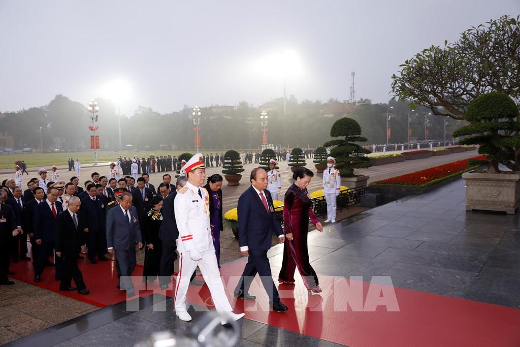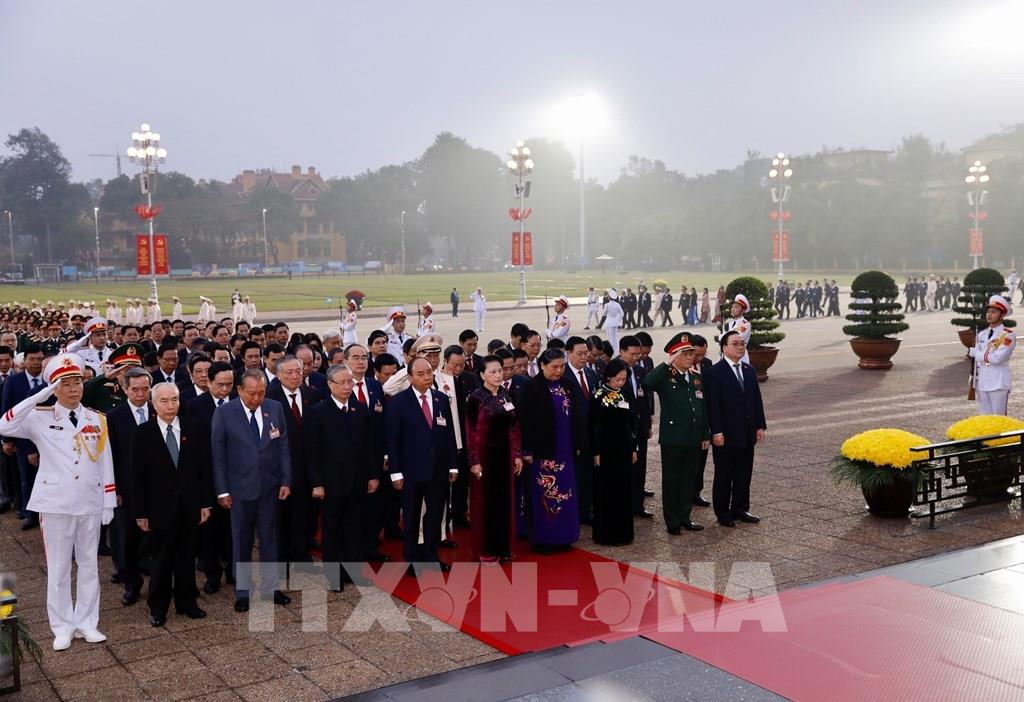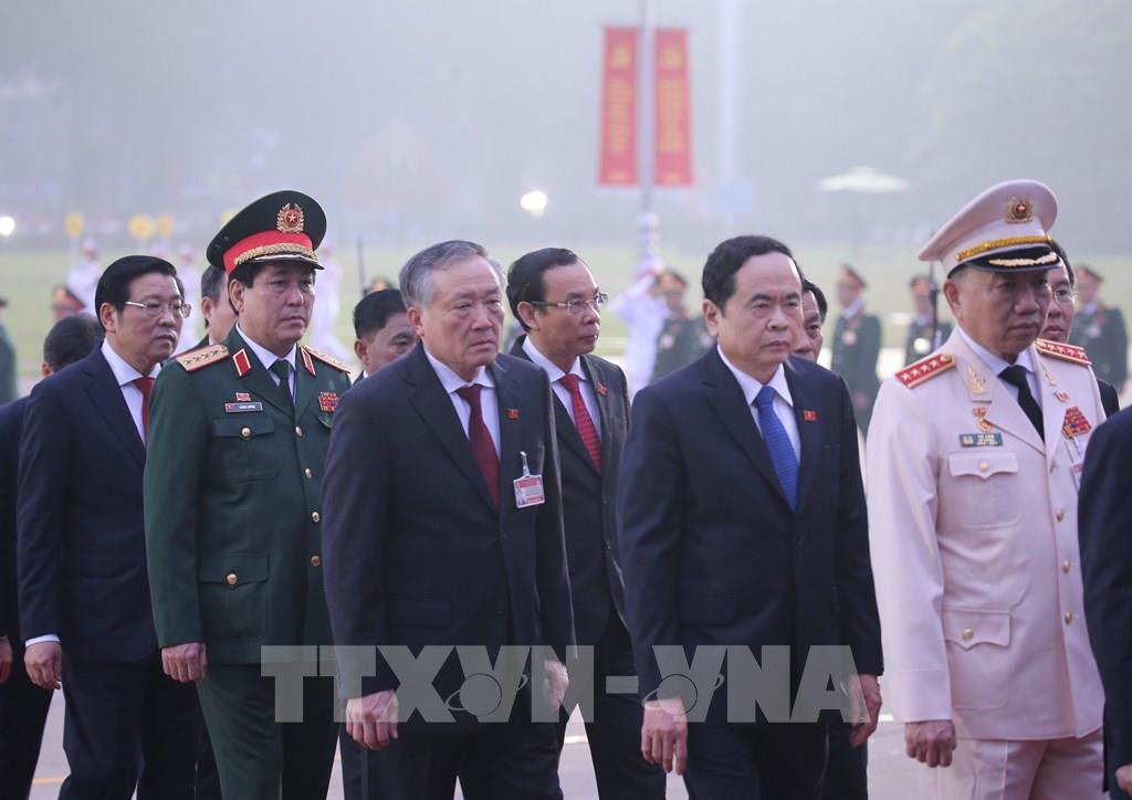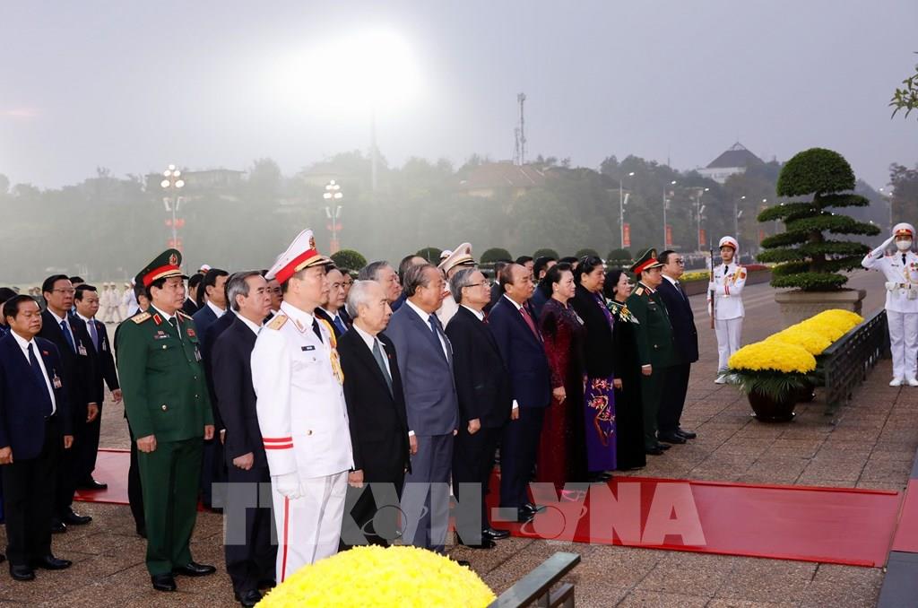 Các đồng chí lãnh đạo Đảng, Nhà nước cùng đại biểu dự Đại hội XIII của Đảng đặt vòng hoa và vào Lăng viếng Chủ tịch Hồ Chí Minh. Ảnh: Dương Giang-TTXVN