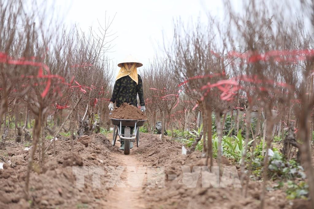 Các chủ vườn thường mua thêm đất bồi vào các gốc đào nhằm tăng dinh dưỡng cho cây. Ảnh: Tuấn Anh - TTXVN