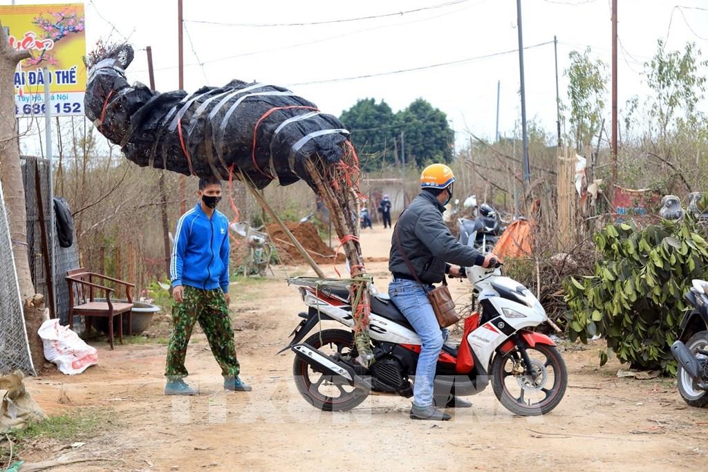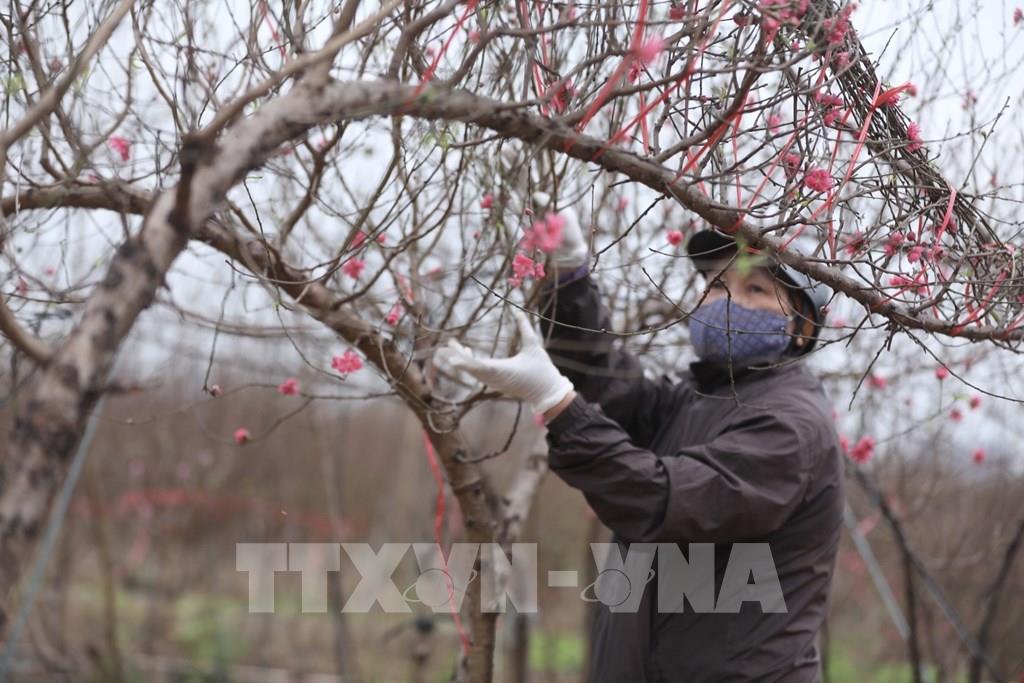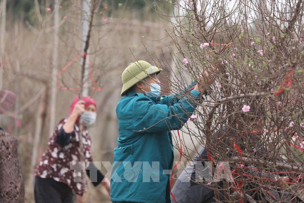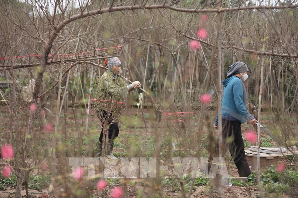 Người dân phường Nhật Tân (quận Tây Hồ) ra vườn hái lá đào, đưa cây lên chậu chuẩn bị phục vụ tết Nguyên đán Nhâm Dần. Ảnh: Minh Quyết - TTXVN