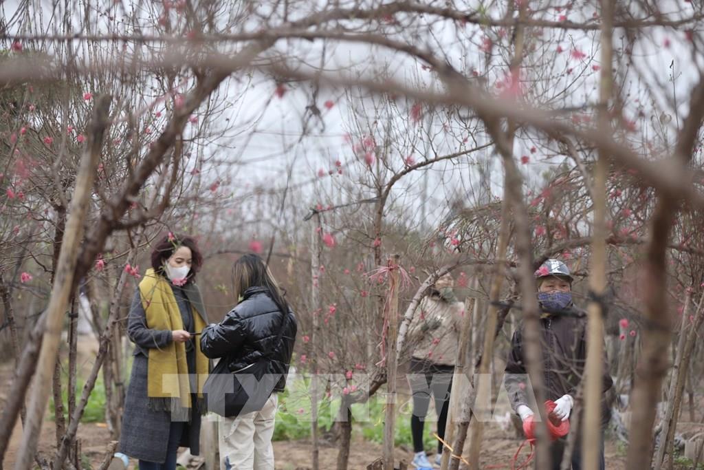 Nhiều khách đã đến vườn đào Nhật Tân chọn mua những cành, cây đào ưng ý. Ảnh: Minh Quyết - TTXVN