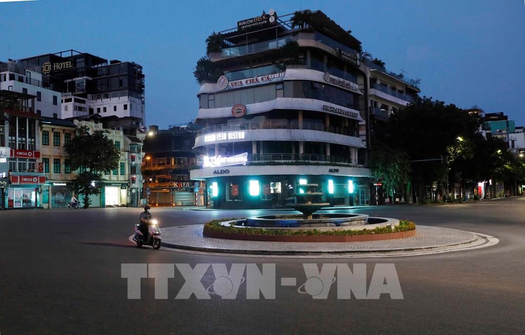 Góc phố Tràng Tiền – Nguyễn Xí vắng bóng người lúc sau 19h. Ảnh: Trần Việt - TTXVN