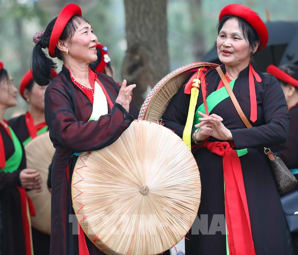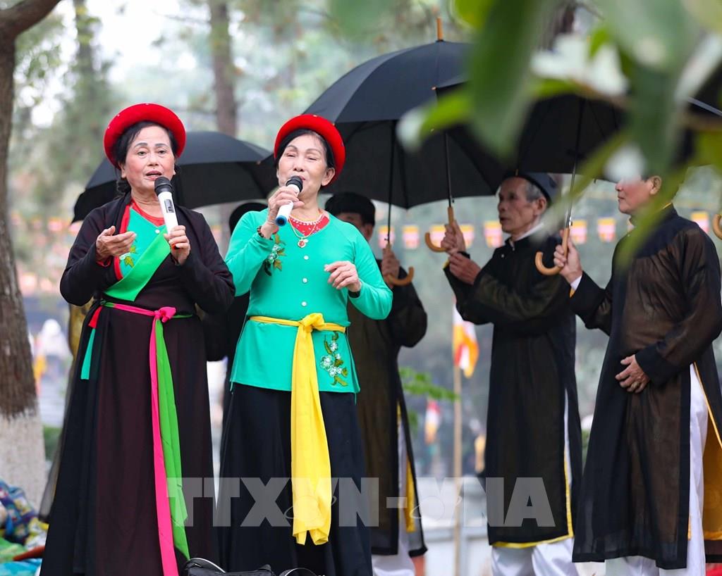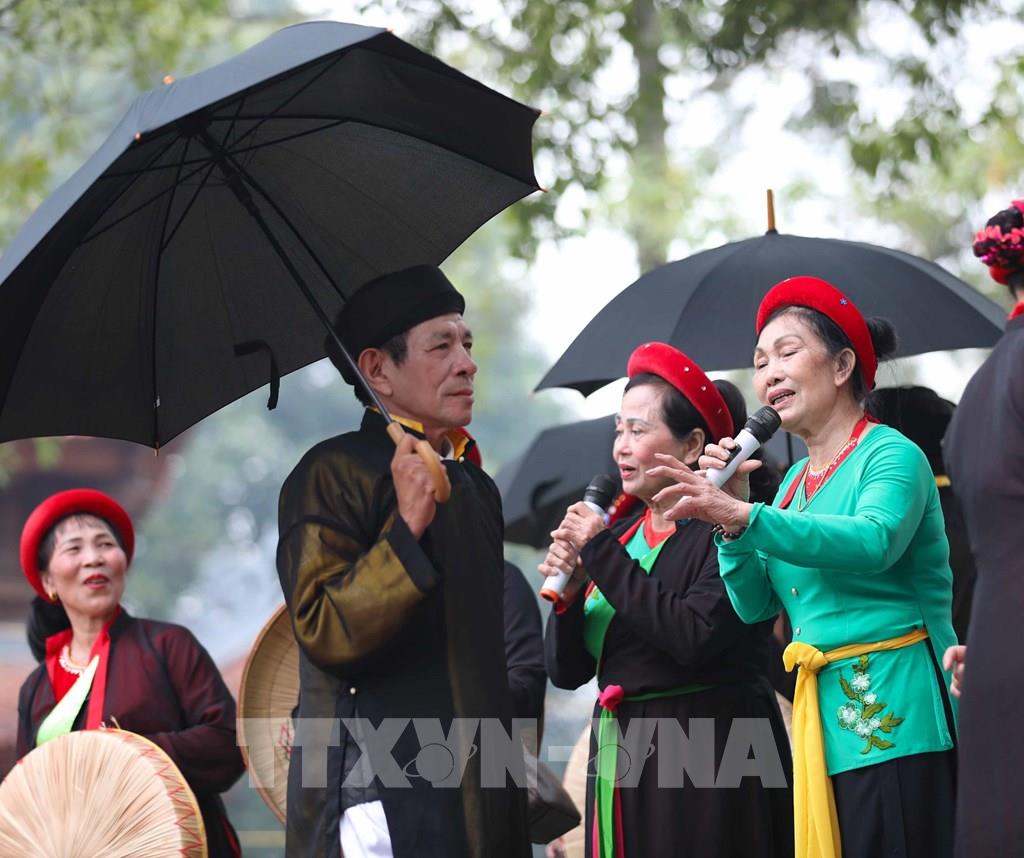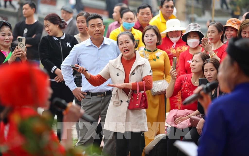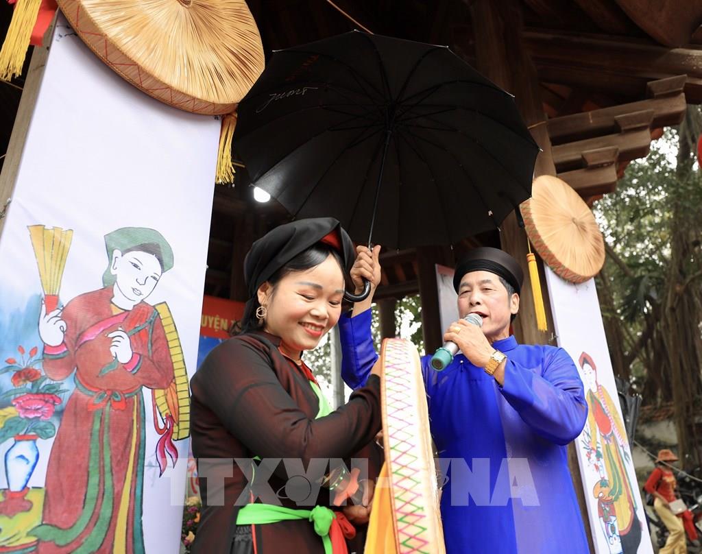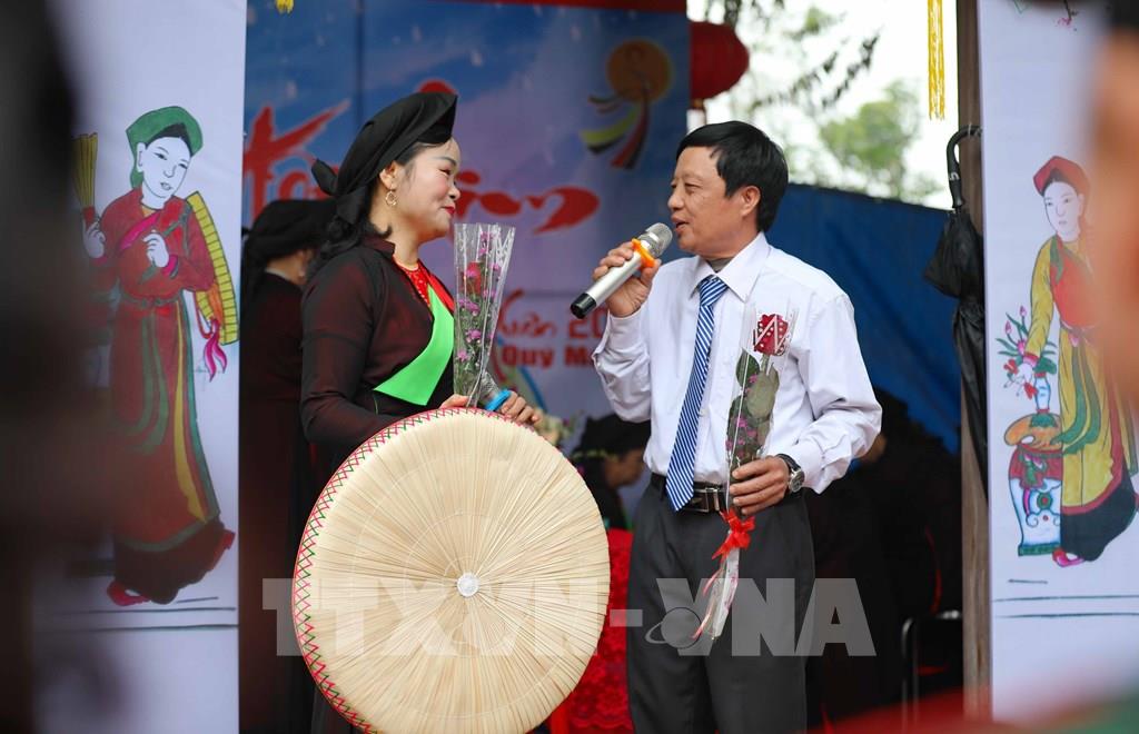 Các thế hệ trẻ tiếp nối truyền thống với màn hát giao duyên quan họ trong ngày hội. Ảnh: Nhật Anh - TTXVN