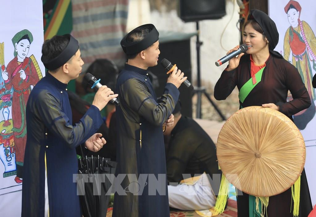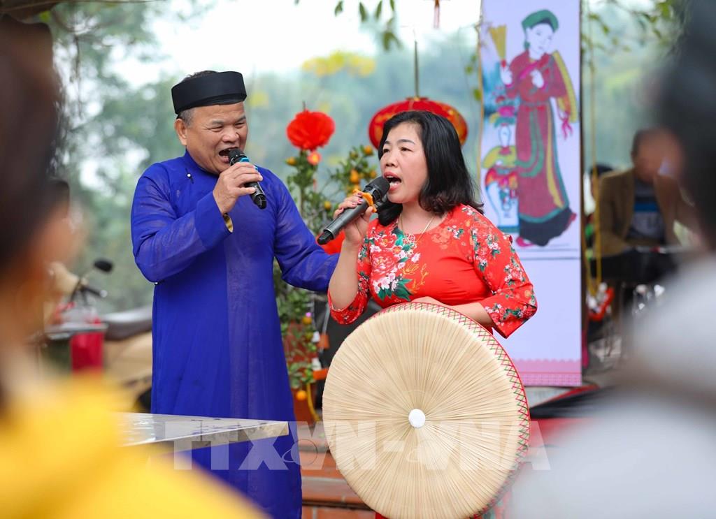 Các liền anh, liền chị trình diễn màn hát giao duyên quan họ trong ngày hội. Ảnh: Nhật Anh - TTXVN