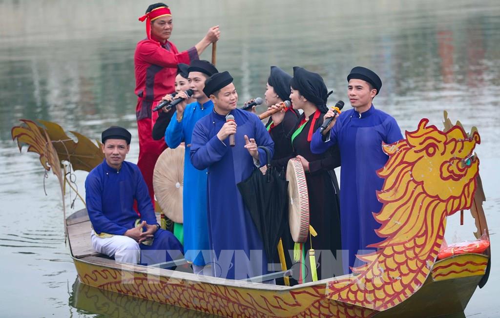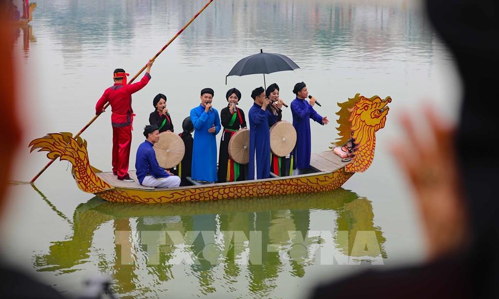 Hát quan họ trên thuyền. Ảnh: Thanh Tùng - TTXVN