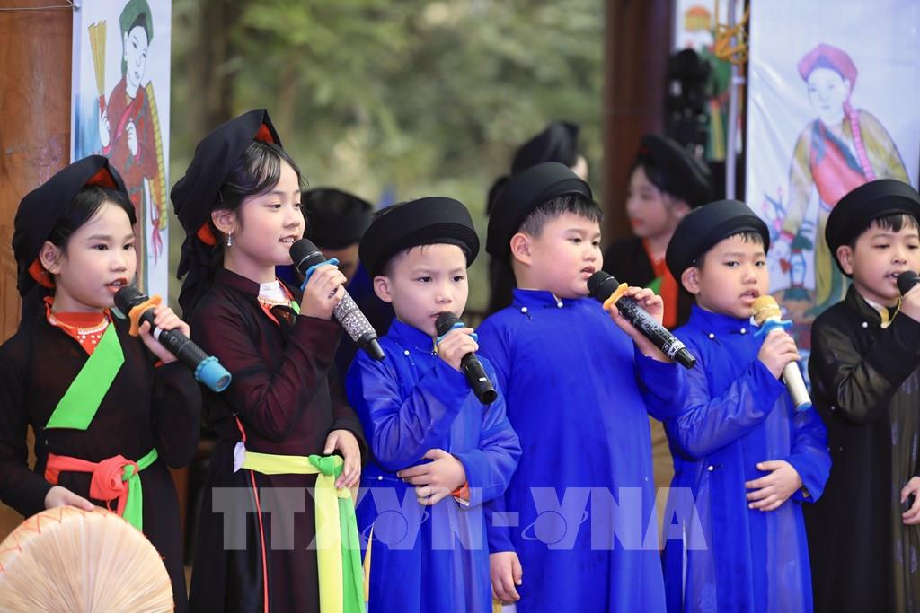 Các liền anh, liền chị "nhí" hát giao duyên quan họ trong ngày hội. Ảnh: Nhật Anh - TTXVN