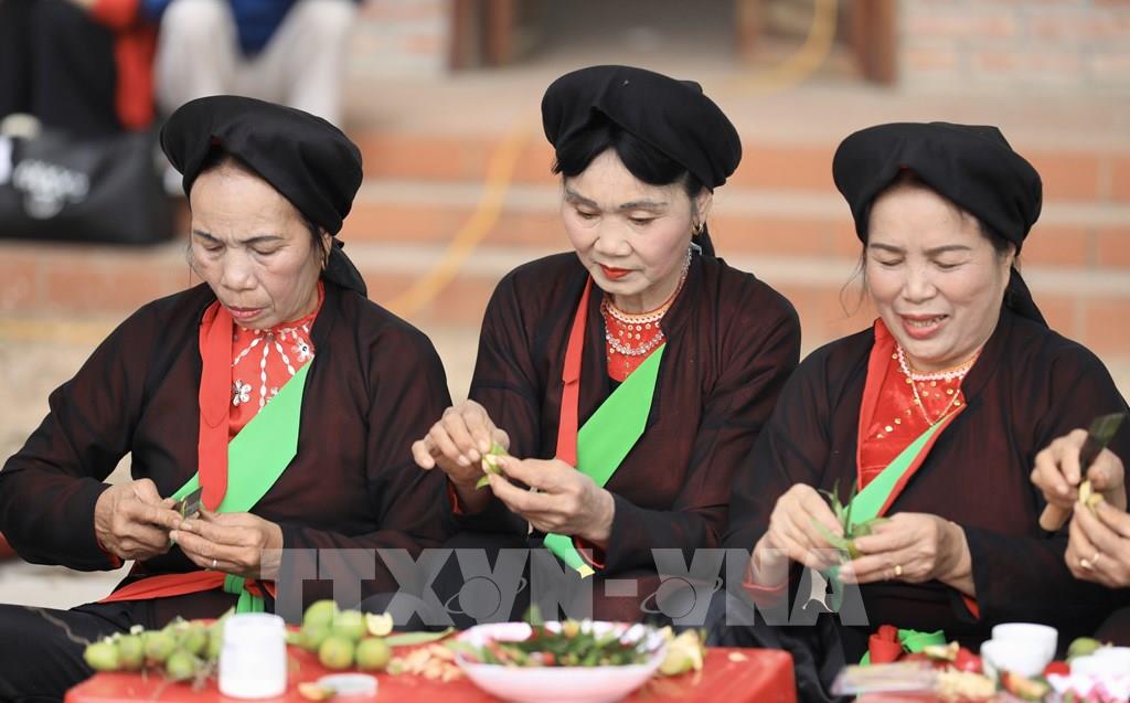 Những miếng trầu têm cánh phượng được các liền chị chuẩn bị mời du khách thập phương. Ảnh: Nhật Anh - TTXVN