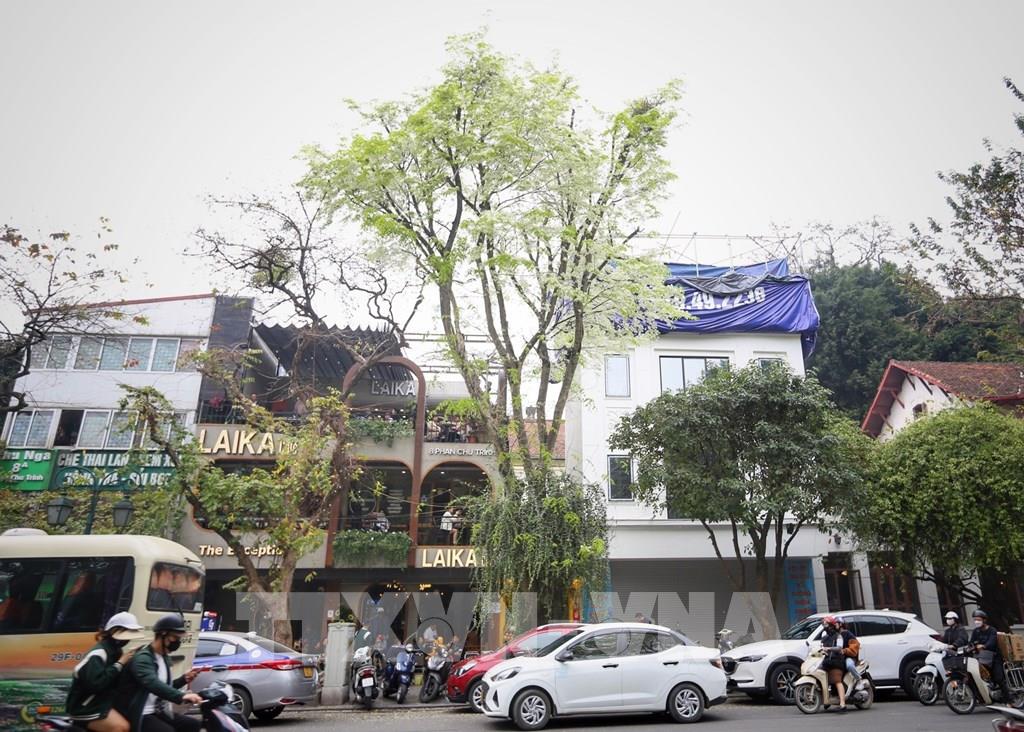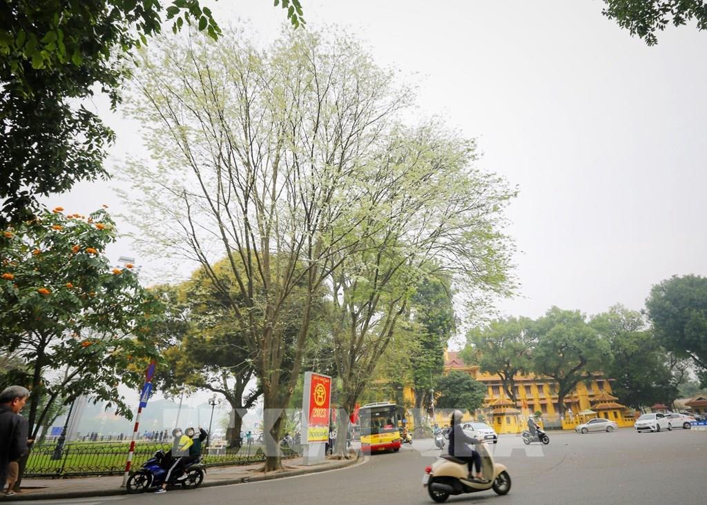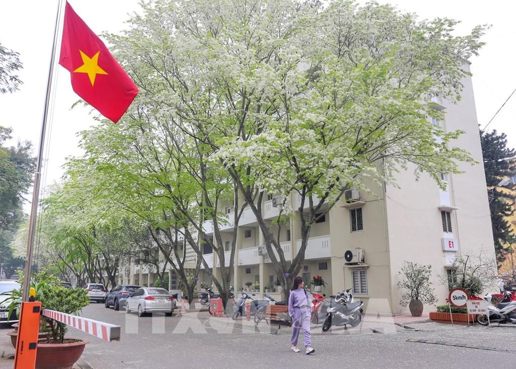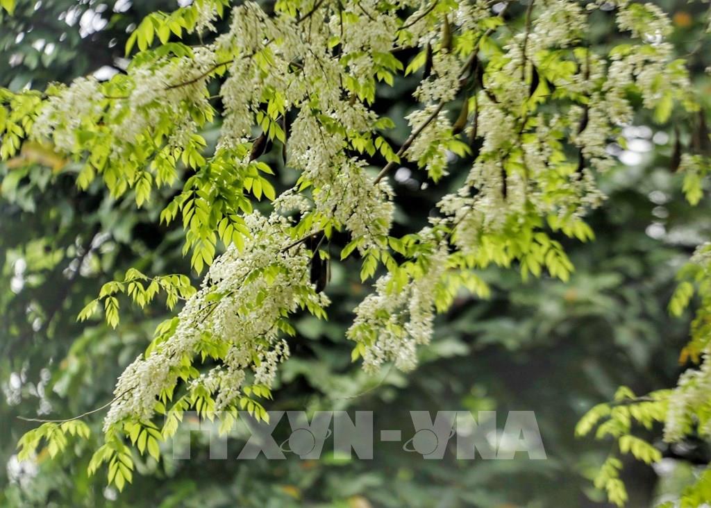 Cây sưa nở hoa trắng trên phố Phan Chu Trinh, quận Hoàn Kiếm. Ảnh: Tuấn Đức - TTXVN
