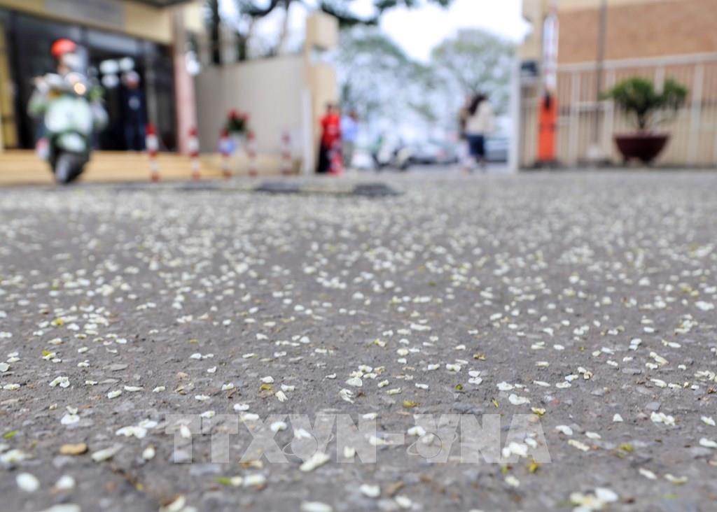 Những cánh hoa sưa rụng trắng một góc phố. Ảnh: Tuấn Đức - TTXVN