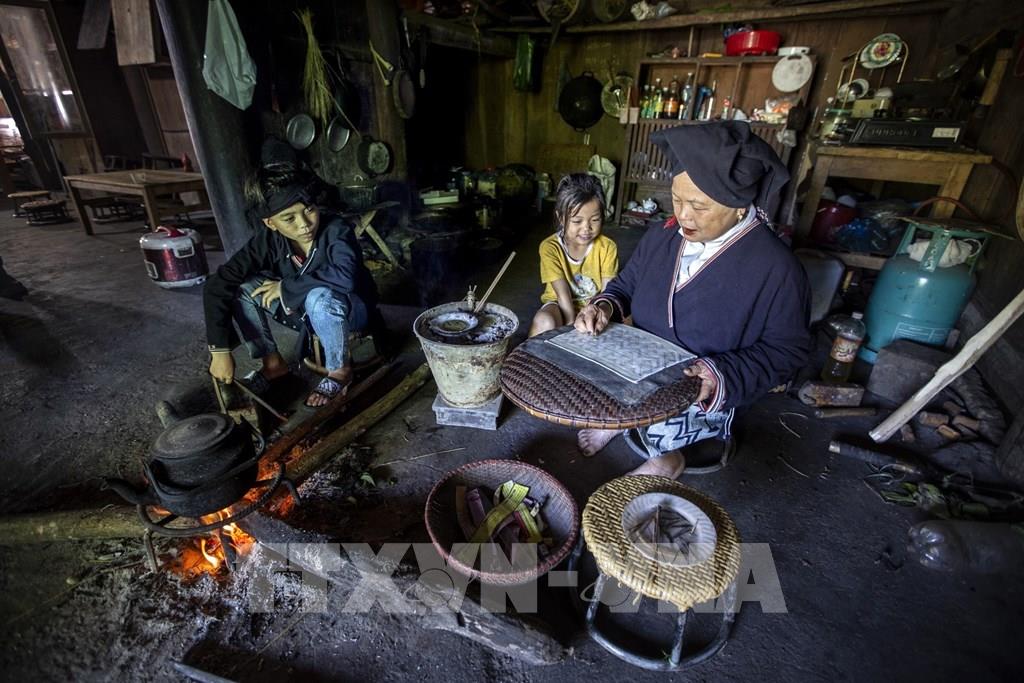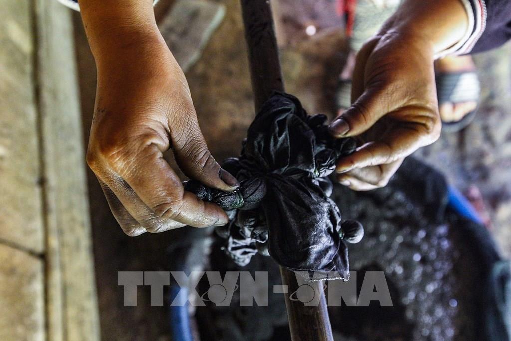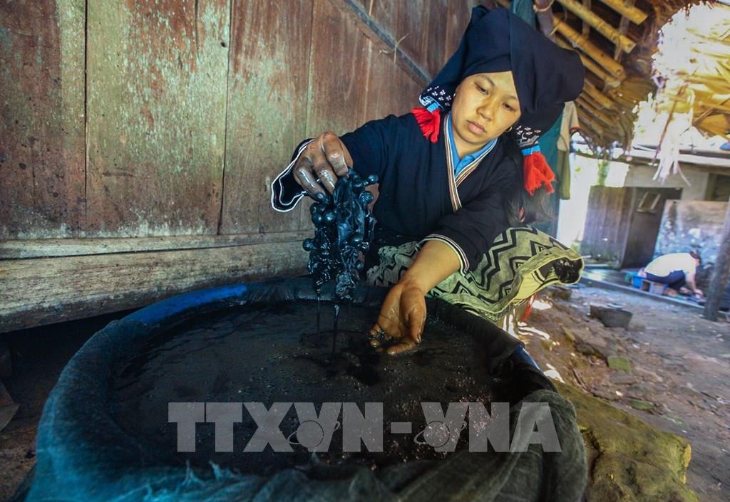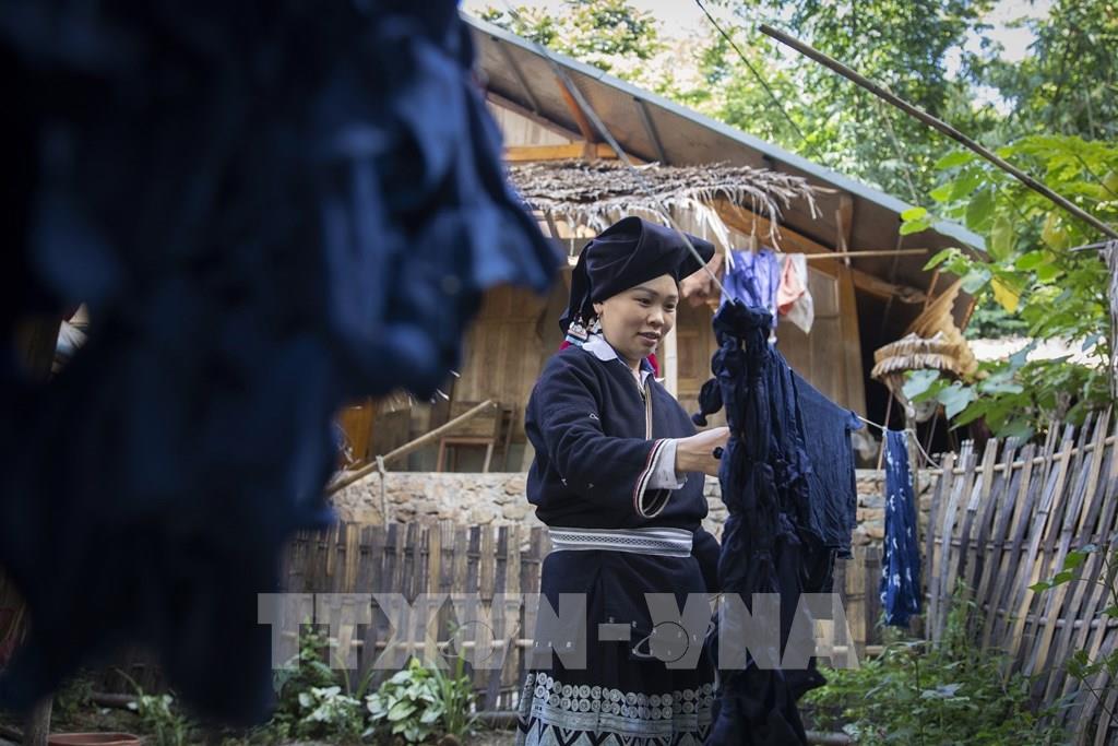 Phụ nữ Dao Tiền ở Bản Sưng tự tay nhuộm chàm, vẽ sáp ong, thêu và may quần áo cho các thành viên trong gia đình. Ảnh: Trọng Đạt - TTXVN