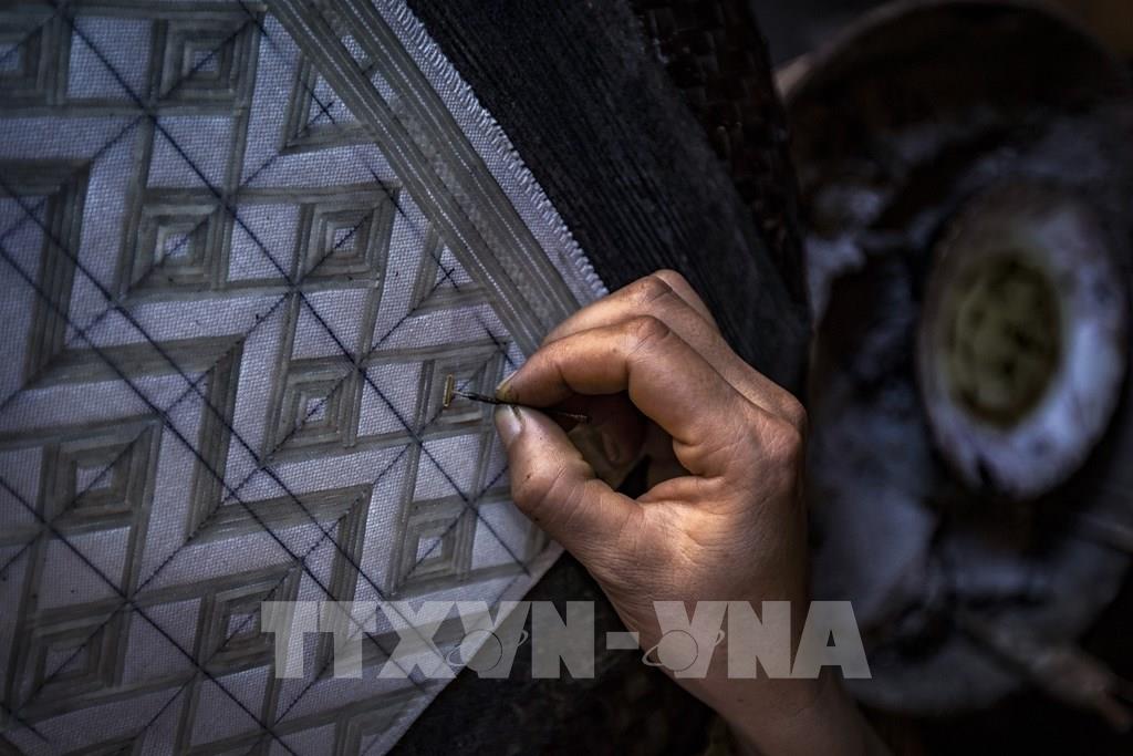 In hoa văn bằng sáp ong lên vải thổ cẩm. Ảnh: Trọng Đạt - TTXVN