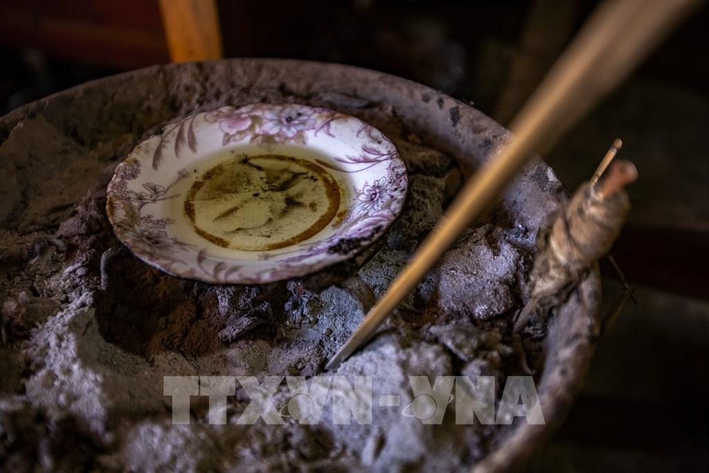 Sáp ong cho vào đĩa nhỏ để trên lên than hoa để duy trì độ nóng để sáp in được mịn và sắc nét. Ảnh: Trọng Đạt - TTXVN