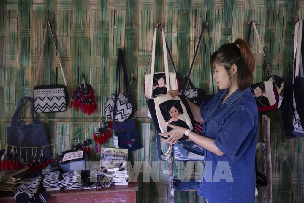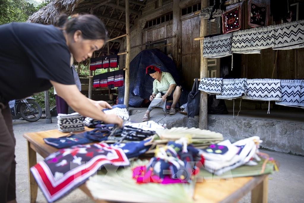 Du khách chọn mua các sản phẩm thổ cẩm của người Dao Tiền ở bản Sưng của xã Cao Sơn, huyện Đà Bắc (Hòa Bình). Ảnh: Trọng Đạt - TTXVN