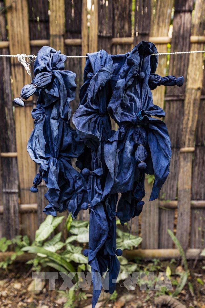 Công đoạn nhuộm vải thường mất thời gian do vải được ngâm trong nước chàm cứ khoảng 20 phút sẽ được vớt ra vắt khô rồi đem phơi nắng, khi vải khô lại cho vào ngâm tiếp trong nước chàm. Việc này lặp đi lặp lại nhiều lần cho đến khi có được màu chàm ưng ý. Ảnh: Trọng Đạt - TTXVN