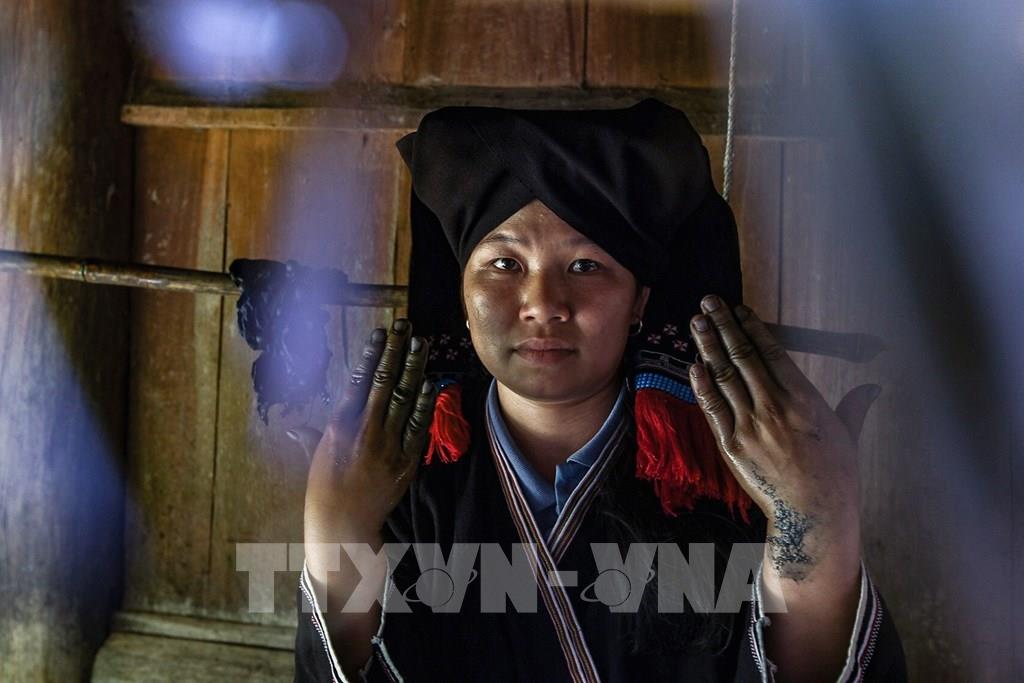 Ngay từ khi lên 10 tuổi các cô gái Dao Tiền đã bắt đầu học thêu thùa, dệt và nhuộm thổ cẩm vì thế đôi bàn tay luôn có màu đen tím. Ảnh: Trọng Đạt - TTXVN